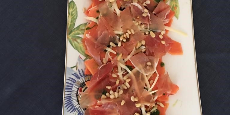 Salpicar o azeite de ervas sobre as fatias do mamão , depois colocar as fatias do presunto e do queijo sobre o Carpaccio.