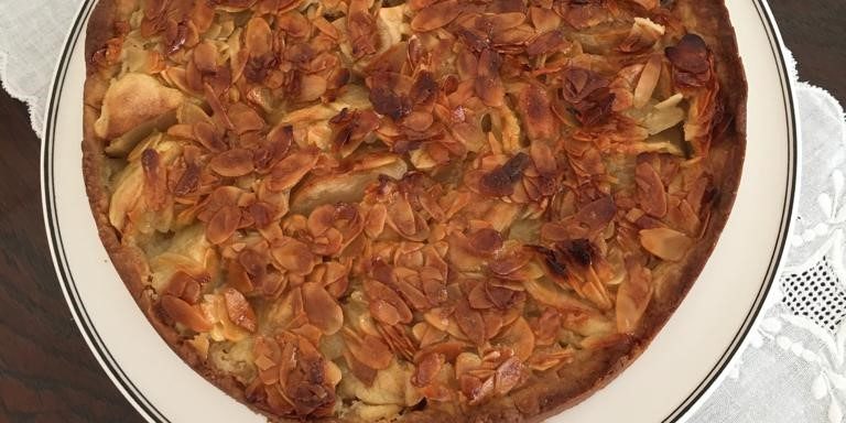Distribuir a maçã sobre a massa. Por fim , espalhar a mistura de amêndoas sobre as maçãs.